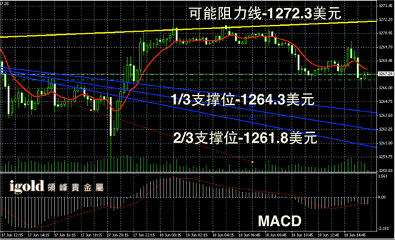 技术回顾:我们早评中,论证指出金价一旦跌破1269美元线,则可能会继续下行,结果中午后黄金价格便不断走跌,且来到了我们给出的区间支撑位附近。