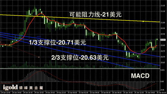 白银阴阳烛录得下探后出现了微幅的U型回升,末端柱体高于红色日平均移动线,短线MACD显示呈中性,白银价格或小幅看涨至20.9美元,但整体在20.6 –21美元区间运行。