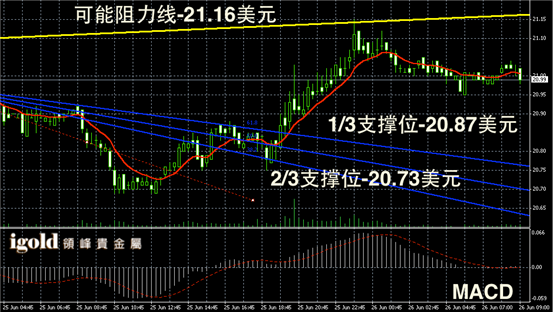 白银阴阳烛录得反弹后,阴烛增多,末端柱体收短,显示21美元线附近阻力较大,短线MACD显示呈中性,后期白银价格或继续小幅上扬。