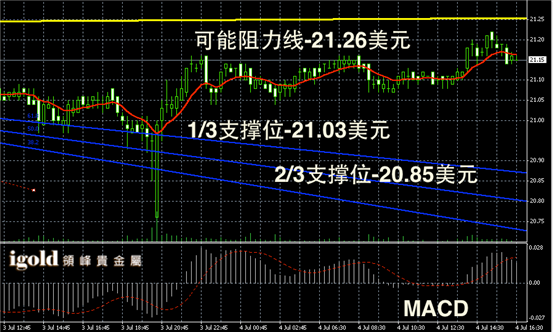 白银阴阳烛录得柱体平均分布在红色日平均移动线中位,后期小幅反弹,短线MACD显示多头主导,白银价格或继续在21.1美元线附近盘整。