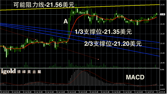白银阴阳烛录得跳涨后,柱体收平,整体处于红色日均线中位,短线MACD显示呈中性,后期白银价格或不断尝试在21.5美元线附近持稳。