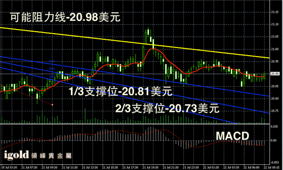 白银阴阳烛录得柱体高低交叉于红色日均线中位,整体录得较短,有小幅回落趋势,短线MACD显示弱势空头主导,白银价格或进一步向20.8美元线附近滑落。