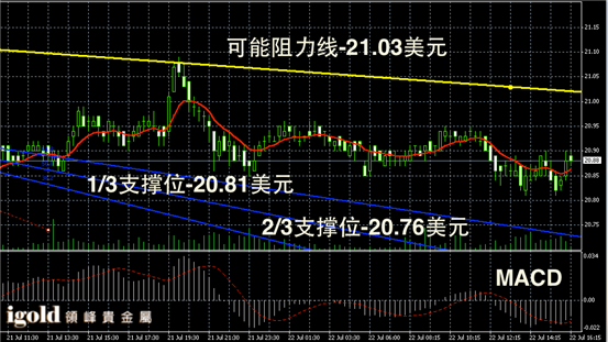 白银长线阴阳烛录得反弹后末端阴烛出现,不过末端录得短阳烛,且回落至红色日均线中位。目前白银长线布林轨道中线小幅下行,短线MACD显示呈中性,RSI录得55,短暂收平,未来白银价格或首先在20.9美元线持稳,下半周或开始回落至20.7美元附近。