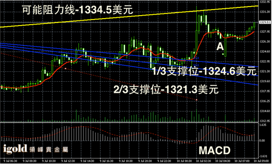 黄金阴阳烛录得后期阳烛增多,且高于红色日平均移动线,短线MACD显示弱势多头主导,后期国际金价或进一步向1330美元线突破,持稳后或继续小幅看涨。