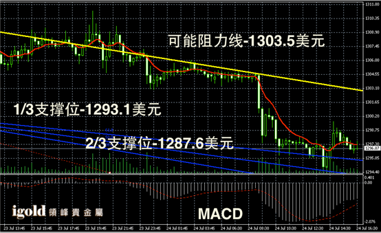 黄金阴阳烛录得短线下行后,末端持稳,阳烛回升,开始处于红色日均线中位,短线MACD显示空头主导,后期金价或继续小幅下探,如果美国数据录得大幅向好,可能向1290美元线附近看跌。