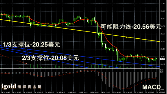白银阴阳烛录得下行后,柱体收短,且聚焦明显,不过短线MACD显示弱势空头主导,市场短线或仍有小幅下探空间,整体首先在20.3美元线持稳,随后则可能看跌至20.2美元线附近。