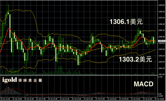 黄金布林轨道中线和下线持稳更加明显,并且还有部分上扬趋势,未来金价或继续在1304美元附近整理,下午或仍有小幅上探至1306美元附近的趋势,不过最终或以回落收场。