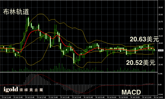白银阴阳烛录得布林轨道均线收平,不过下线有小幅攀升的趋势,且短线MACD显示呈中性,白银价格下午或向20.6美元附近靠拢。