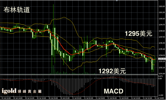 黄金布林轨道录得中线和下线继续偏空,不过均线小幅持稳,显示1294美元附近的支撑较强,目前空头仍然主导市场,市场下午或首先在1295美元附近持稳,随后继续对1290美元支撑进行测试;若持稳1295美元则可能小幅反弹。