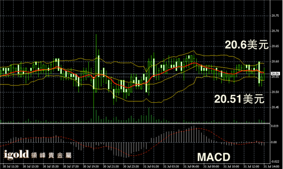 白银阴阳烛录得布林轨道基本收平,均线整体收平,短线MACD显示呈中线,未来白银价格或继续在20.5-20.6美元区间盘整。