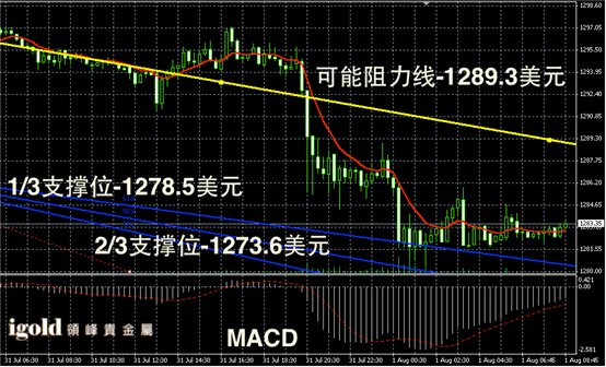 黄金阴阳烛录得下行后,柱体收短,且重回日均线中位,短线MACD显示空头正在消散,金价上午或在1283美元附近不断持稳,并可能向1286美元附近看涨。
