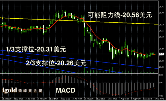 白银阴阳烛录得下行后,聚焦明显,不过日均线仍有下行趋势,短线MACD显示弱势空头主导,短线白银价格或在20.3-20.4美元区间偏空震荡,建议逢高看空。