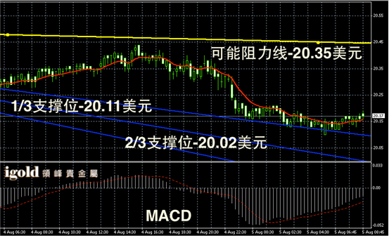 白银阴阳烛录得阴烛缓慢增多,趋势小幅下行,短线MACD显示弱势空头主导,白银阴阳烛录得或在20.2美元附近不断持稳。