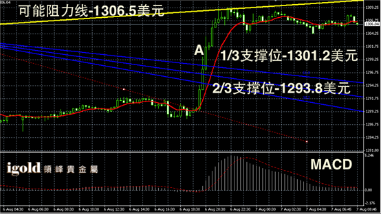 黄金阴阳烛录得波段反弹趋势明显,后期录得柱体收短,且处于红色日均线中位,短线MACD显示弱势多头主导,短线金价或首先在1305美元附近持稳,可能伴随小幅的下探。