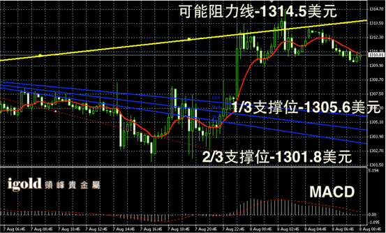 黄金阴阳烛录得攀升后,阴烛增多,柱体收短且处于均线中位,短线MACD显示呈中性,金价短线或回落对1310美元支撑进行测试。