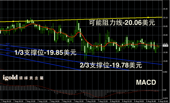 白银阴阳烛录得阴烛增多,且出现小幅回落趋势,短线MACD显示弱势空头主导,未来白银价格或继续小幅下探,向19.9美元附近滑落。