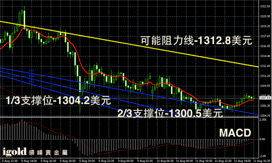 黄金阴阳烛录得柱体较短,阴阳烛间隔出现,短线MACD显示呈中性,后期柱体小幅高于红色日均线,黄金价格整体在1307美元以上持稳,晚上若美指没有较大幅反弹,金价或小幅反弹冲击1310美元。