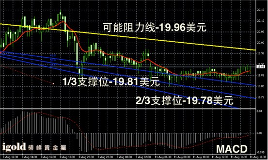 白银阴阳烛录得持稳后,小幅反弹,后期柱体高于红色日均线,短线MACD 显示弱势空头主导,白银价格或向19.95美元附近靠拢。