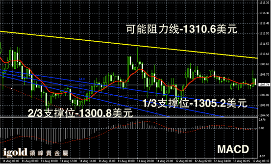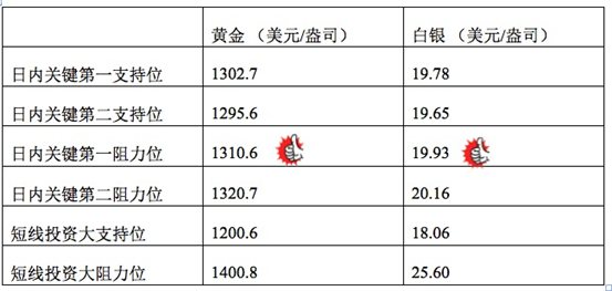 技术回顾:晚评中,我们指出金银价格或在持稳后,小幅反弹,明确判断出金价会反弹至1310美元附近的趋势,同时高位阻力线上我们也给出了与市场符合的数据。