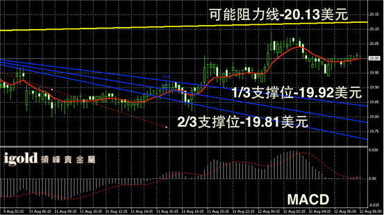 白银阴阳烛录得反弹后,柱体收短,且后期处于红色日均线中位,短线MACD显示弱势空头主导,后期白银价格或小幅回调至19.95美元附近。