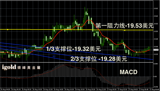 白银阴阳烛录得末端阳烛增多,且高于红色日均线,短线MACD显示呈中性,上午白银价格或不断反弹到19.45美元附近。
