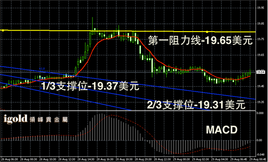 白银长线阴阳烛录得开始回升至红色日均线中位,末端录得阳烛,不过长线MACD显示空头主导,RSI录得41,回落后收平,白银价格反弹后进入回调过程,周末收盘前或主要围绕19.5美元进行盘整,并偏于逐步上探到19.6美元附近。