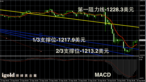 黄金阴阳烛录得下行后,末端出现U型反弹,且柱体仍然低于红色日均线,短线MACD显示空头主导,短线若持稳1223美元则可能向1225美元附近攀升,否则或再次回落至1218美元附近。另外美元指数能否回调,也是金价反弹的重要参考指标。