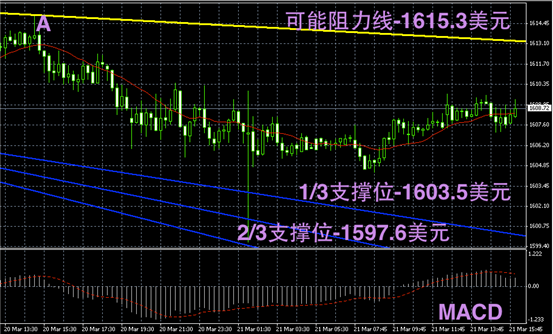黄金阴阳烛录得后期柱体开始小幅高于红色日平均移动线,且短线MACD显示多头正不断积聚,预期未来或有小幅的反弹上行。不过整体上录得影线不明显,且柱体较短,上行幅度或比较小,区间阻力线可首先参考阳柱A的最高价。