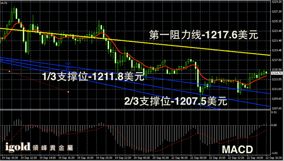 黄金阴阳烛录得下行后,后期阳烛增多,且高于红色日均线,短线MACD显示空头有所消散,黄金价格短线或继续在1210-1220美元区间持稳,若跌破1210美元或继续下行,突破1218美元前或偏于盘整。