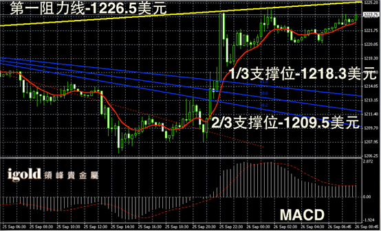 黄金阴阳烛录得反弹后,柱体收短,不过后期依然阳烛主导,且小幅高于红色日均线,短线MACD显示弱势多头主导。黄金价格上午或不断上探1225美元附近,若美指继续反弹,金价或承压下行。