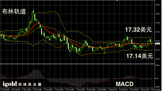 白银阴阳烛录得聚焦明显,柱体处于红色日均线中位,短线MACD显示呈中性,白银价格下午或继续浮动在17.23美元上下,若美指回落,白银价格或尝试突破17.3美元。