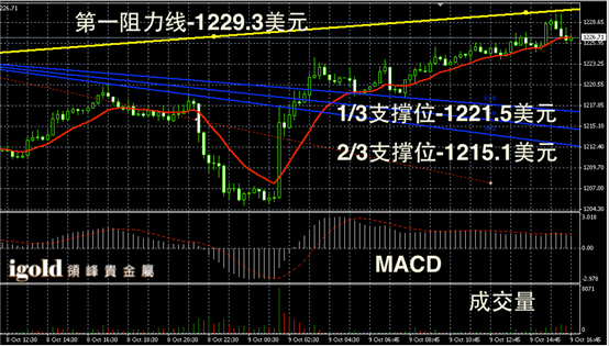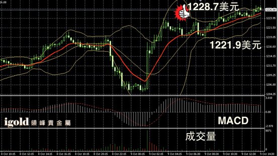黄金阴阳烛录得后期阴烛增多,且回落至红色日均线中位,短线MACD显示多头主导,成交量在欧盘有所增加,美指在85附近支撑较强或很难跌破,晚上黄金价格或在1228美元附近整理,并小幅回调至1223美元,若美指跌破85,那么市场或尝试突破1230美元。