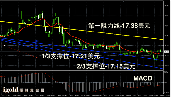 白银阴阳烛录得波段下行趋势明显,离散率增加,短线MACD显示弱势空头主导,白银价格晚上或围绕17.3美元附近整理,但是整体偏空,或多次震荡下探17.25美元附近。