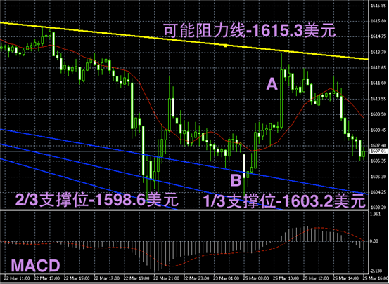 黄金阴阳烛录得前后高低交叉于红色日平均移动线,且阴阳烛间隔出现,趋势不稳定,短线MACD显示多头和空头交替主导,预期未来或继续区间内高低震荡,高位阻力线可参考阳烛A的最高价,低位支撑可参考阴烛B的最低价。