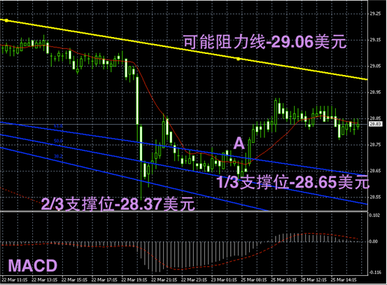 白银阴阳烛录得前后比值差异小,且整体处于红色日平均移动线中位,短线MACD显示多头和空头均不明显,运行趋势较为稳定,预期短线或在弱势多头下窄幅震荡。