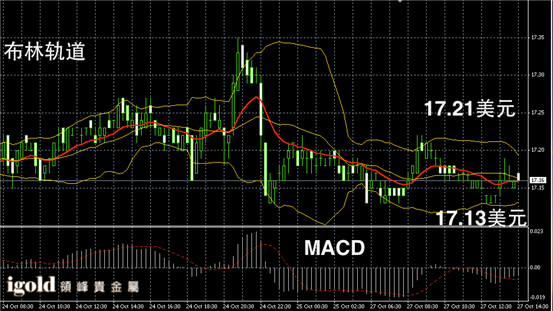 白银阴阳烛录得柱体较短,短线MACD显示弱势空头主导,布林轨道小幅收窄且比较平缓,白银价格下午或继续浮动在17.17美元附近。若跌破17.15美元,或向17.12美元附近靠拢。
