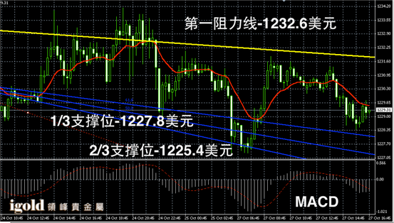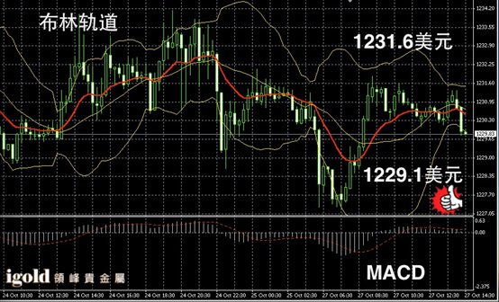 黄金阴阳烛录得低于红色日均线,短线MACD显示弱势空头主导,晚上金价若不能持稳1229美元,或继续下探1227美元附近。持稳则偏于回升至1231美元附近。