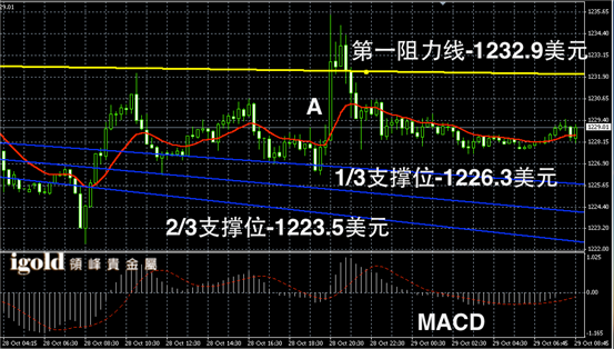 技术回顾:昨晚的评论中,我们特别指出金价小幅突破1230美元附近后会回落至1226美元整理,这一判断与昨晚的走势完全一致。