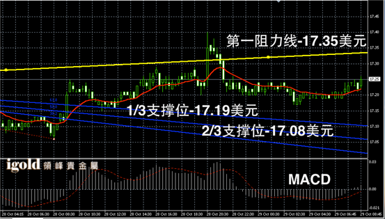 白银长线阴阳烛录得柱体较短,且处于红色日均线下方,长线MACD显示弱势空头主导,RSI录得43,不断回升。白银价格日线突破17.2美元附近后,或不断反弹,日线尝试突破17.3美元。