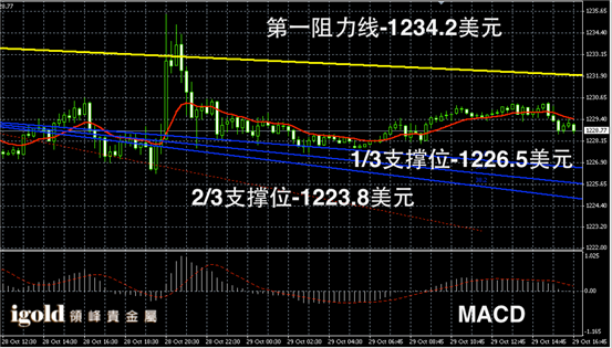 黄金长线阴阳烛末端录得吊颈线,且低于红色日均线,显示回落放缓,长线MACD显示呈中性,长线RSI录得49,暂时收平,黄金价格日线持稳,但是多头明显不足,市场能否反弹取决于1230美元,未突破前或继续在1226美元附近偏空整理。