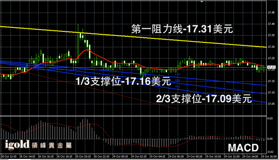 白银长线阴阳烛录得柱体较短,且处于红色日均线下方,长线MACD显示弱势空头主导,RSI录得43,不断回升。白银价格日线突破17.2美元附近后,或不断反弹,日线尝试突破17.3美元。