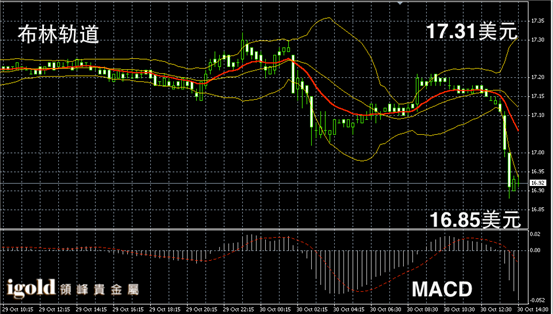 白银阴阳烛录得布林轨道区间扩大,且柱体低于红色日均线,短线MACD显示空头增加,白银阴阳烛或小幅持稳16.9美元,并偏于回升至17美元附近。若美指继续攀升,白银价格或继续回落至16.8美元附近。