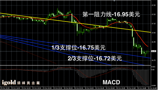 白银阴阳烛录得连续下行后,末端柱体收短,不过仍然低于红色日均线,短线MACD显示空头主导,白银价格或在16.85美元附近横盘运行,美指若攀升则可能下探16.8美元附近。