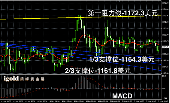 黄金阴阳烛录得高低交叉于红色日均线,阴阳烛间隔出现,短线MACD显示呈中性,黄金价格短线或继续在1168美元附近持稳,美指若回落,金价或再次突破1170美元。