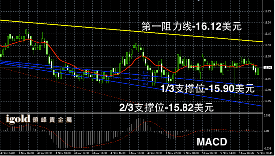 白银阴阳烛录得横盘运行趋势明显,短线MACD显示呈中性,白银价格或进一步持稳16美元,若美指回落,白银价格或小幅攀升至16.1美元附近。