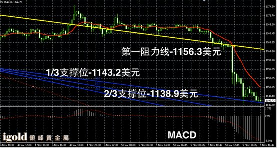 技术回顾:午评中,我们提醒投资者留意1150美元支撑,指出市场跌破或会进一步下行,这一预测与下午的走势保持一致,同时低位支撑上,我们也给出了准确的预测。