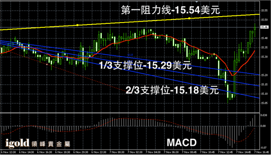 白银阴阳烛录得连续阳烛,反弹趋势明显,短线MACD显示多头主导,白银价格或在15.45美元附近持稳,并尝试突破15.4美元。