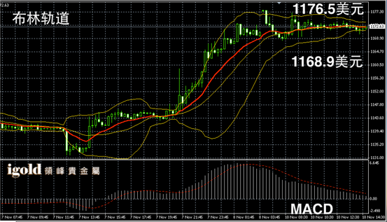 黄金阴阳烛录得布林轨道收窄,且柱体处于红色日均线中位,短线MACD显示呈中性,黄金价格下午或浮动在1173美元附近,并且偏于下行测试1171美元支撑位。