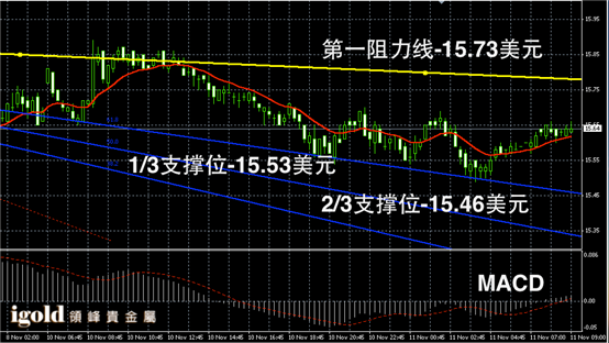 白银阴阳烛录得波段震荡趋势明显,末端阳烛增多,且小幅高于红色日均线,短线MACD显示呈中性,白银价格短线或不断尝试突破15.7美元附近。