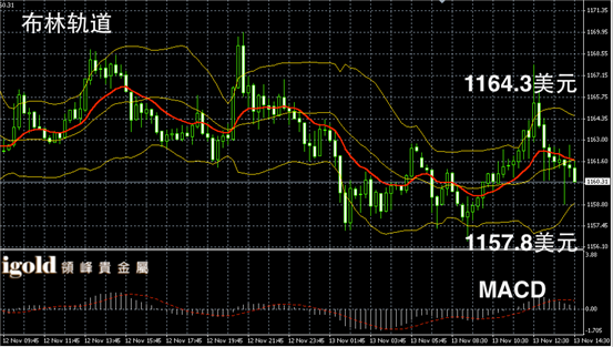 黄金阴阳烛录得柱体离散率增加,后期阴烛回落,布林轨道录得区间收平,短线MACD显示呈中性,且多空连续反复,金价短线或继续浮动在1162美元上下,若持稳1158美元,便偏于小幅反弹。